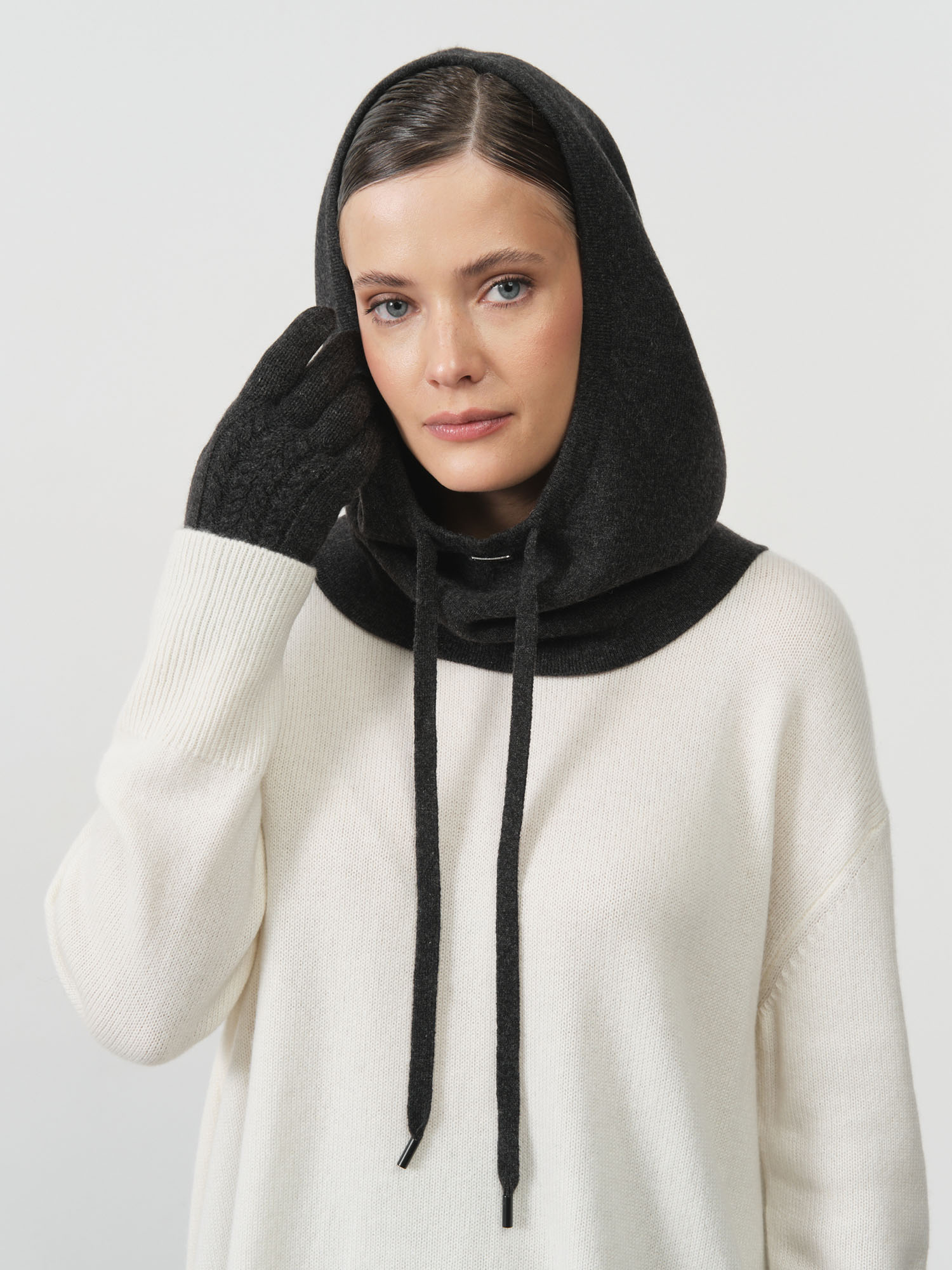 Мягко облегает голову, защищает уши и шею от холода. Посадка комфортная, без давления. Универсальный размер подходит большинству типов лица и позволяет носить капор как поверх причёски, так и на гладкие волосы.