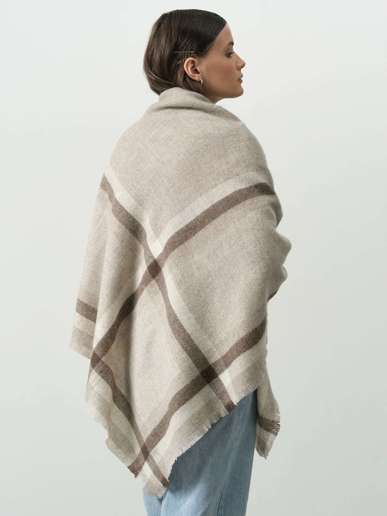Бежево-серая основа с контрастной коричневой клеткой — гармоничное сочетание природных оттенков, которое легко вписывается в базовый гардероб.