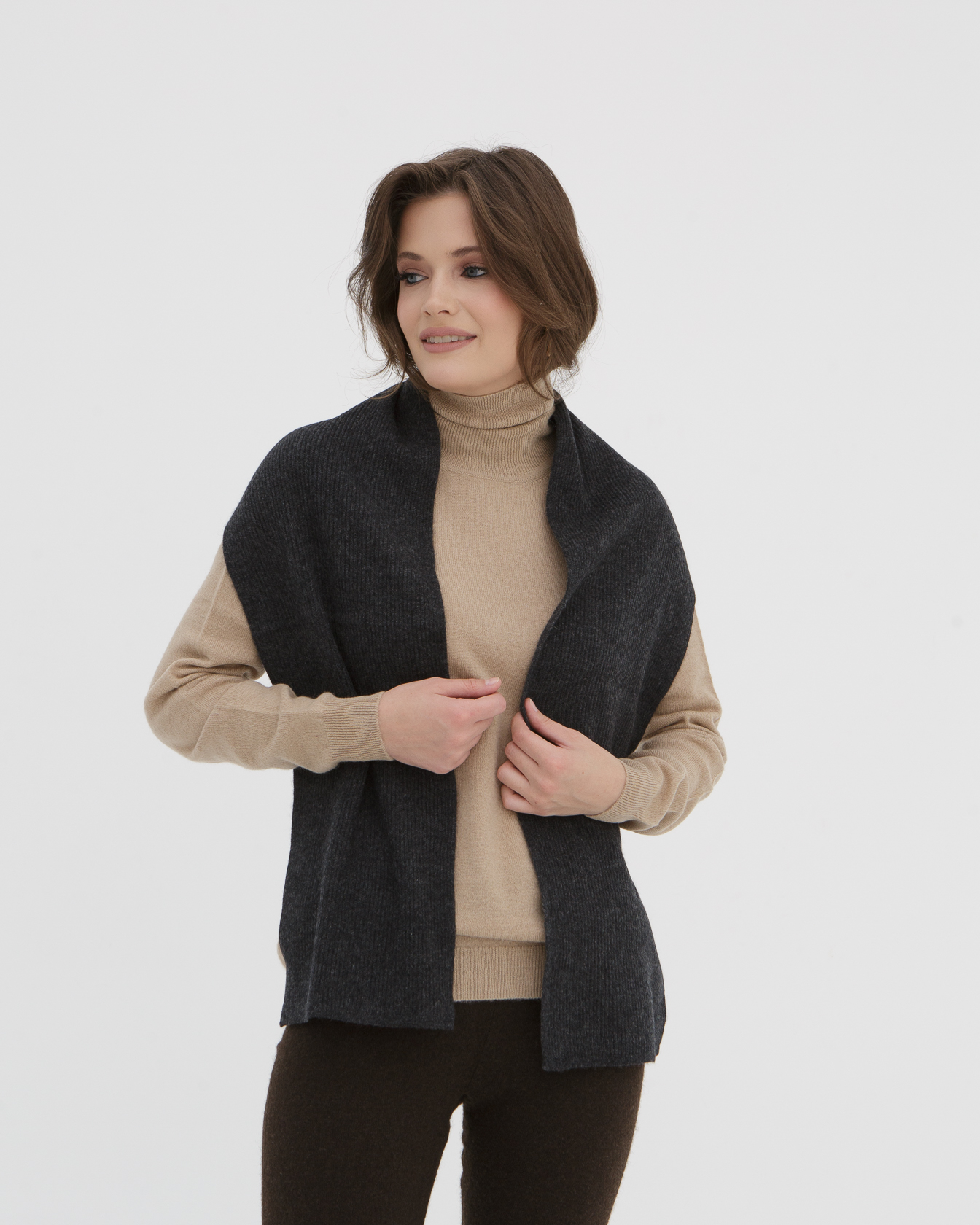 Классическая прямоугольная форма с гладкой аккуратной вязкой. Минималистичный дизайн без декоративных элементов подчеркивает благородство материала и делает изделие универсальным. Полотно мягко драпируется, создавая аккуратный и элегантный силуэт.