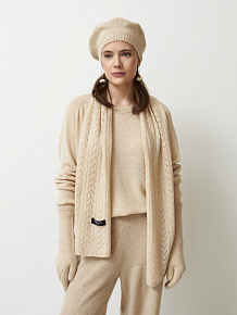 Модель выполнена в классической прямоугольной форме с изящным фактурным узором в виде вертикальной косы. Декоративная вязка придаёт аксессуару глубину и подчёркивает натуральную текстуру кашемира.
