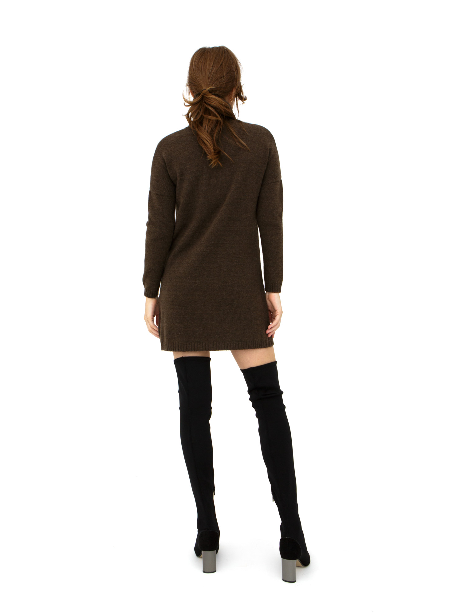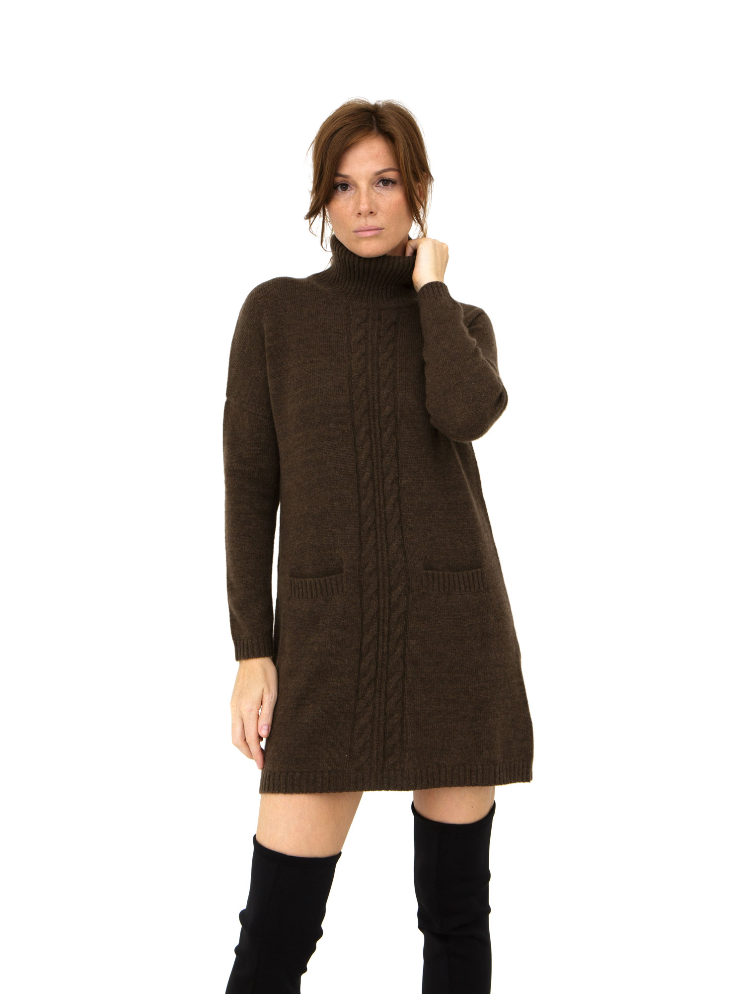 Элегантный женский джемпер-платье из пуха яка в стильном темно-коричневом цвете — идеальное решение для холодного времени года. Этот джемпер-платье сочетает в себе непревзойденное тепло, комфорт и модный дизайн. Высокий воротник-стойка и декоративные косы на передней части добавляют изделию утонченный стиль, а два удобных кармана делают его практичным для повседневной носки.