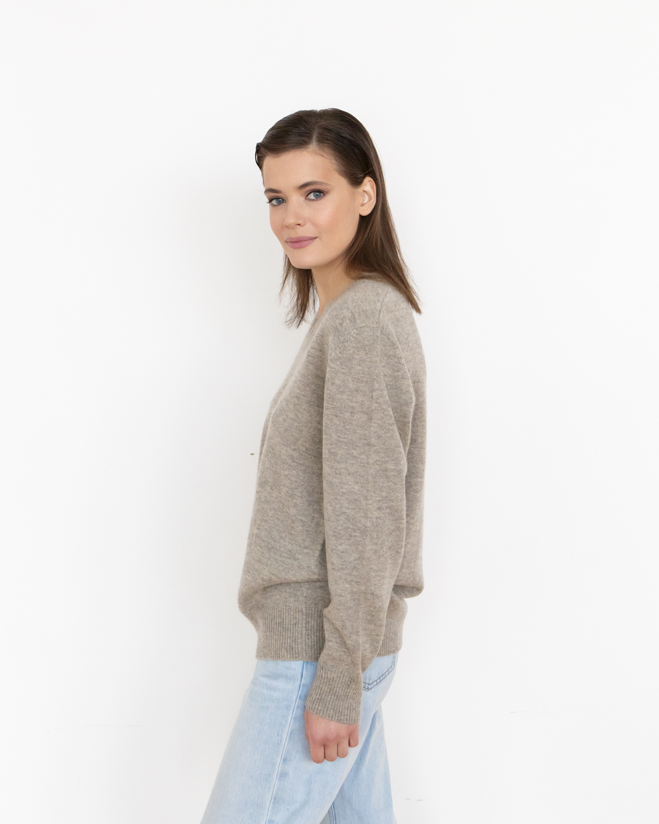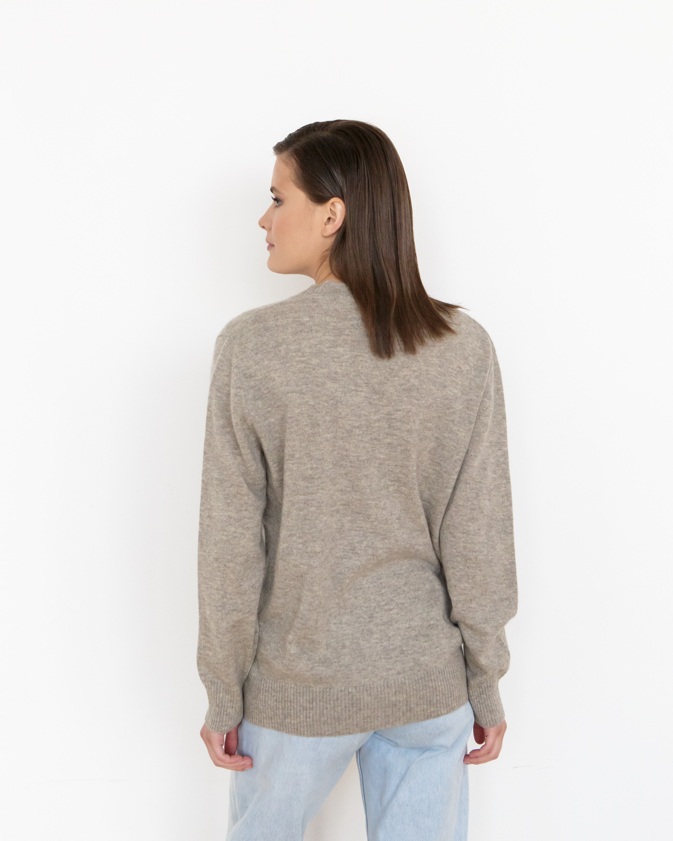 V-образная горловина, аккуратная трикотажная отделка манжет и нижнего края изделия. Ровная вязка сохраняет форму и подчёркивает аккуратность силуэта.
