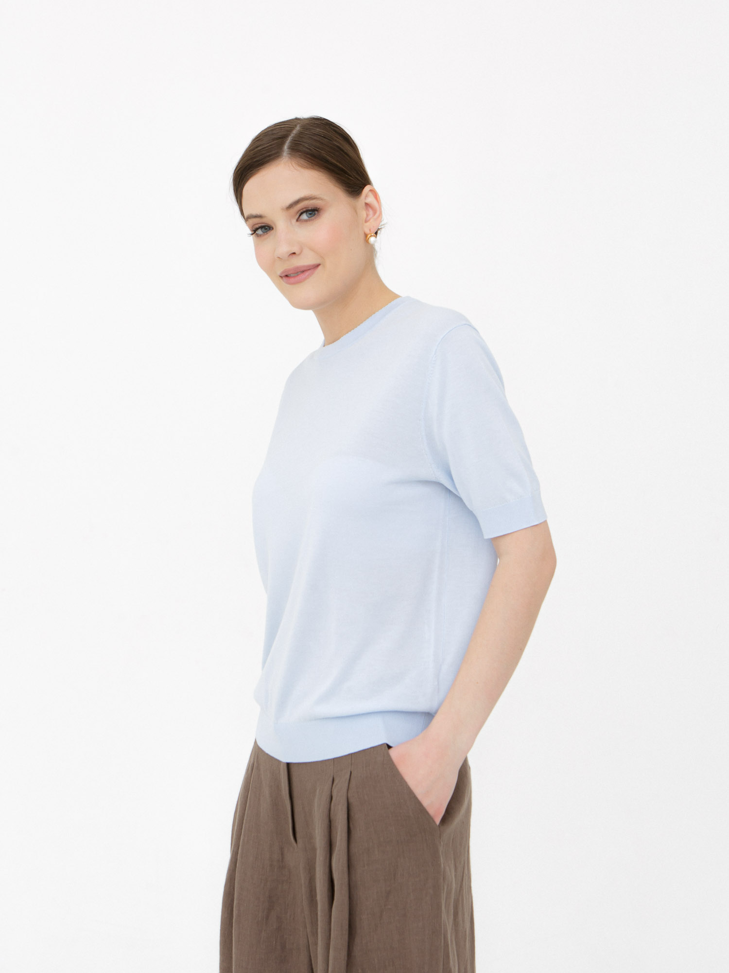 Состав очень интересный - лиоцелл, лакрица, хлопок - качество натуральных тканей чувствуется сразу. Ткань дышит, не электризуется, очень приятная к телу. Голубой цвет нежный