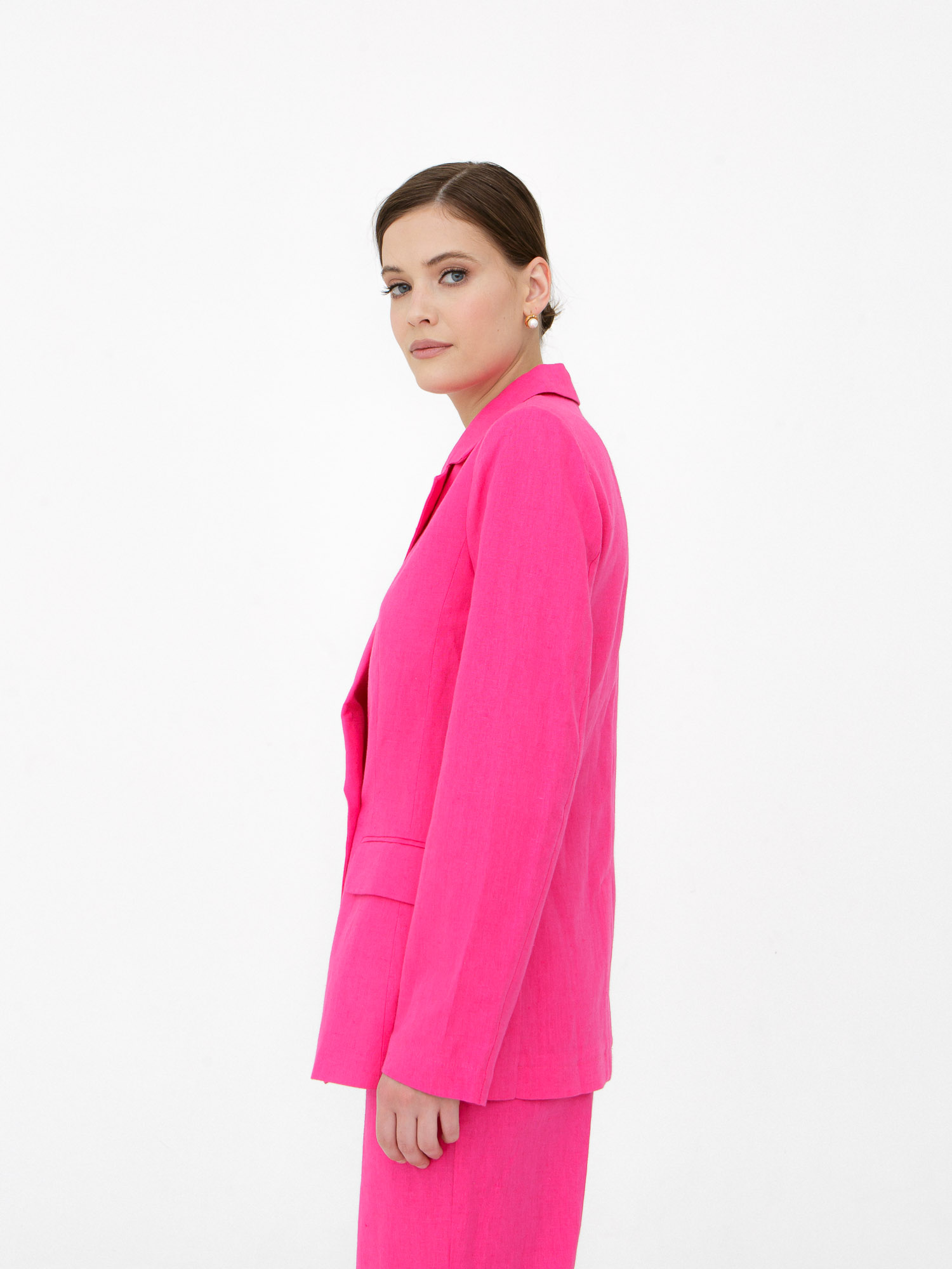 Женский жакет из льна и хлопка в оттенке фуксия — выразительная модель для стильного летнего гардероба. Яркий цвет и четкий силуэт создают эффектный образ, подчеркивая уверенность и индивидуальность. Жакет идеально подходит как для деловых образов, так и для модных повседневных сочетаний.