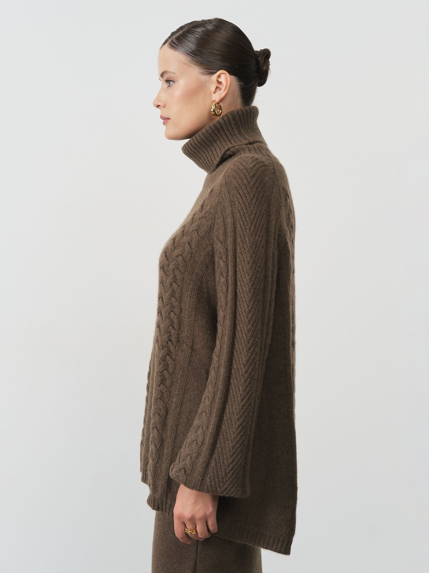 Модель выполнена с высоким воротником и свободным силуэтом. Свитер украшен рельефной вязкой с косами и геометрическими элементами, которые придают изделию объёмную текстуру и выразительный характер.