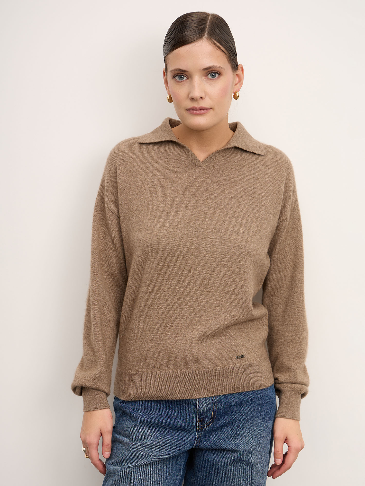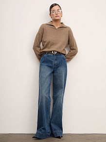 Модель выполнена с аккуратным воротником-поло и лаконичной гладкой вязкой. Свободный силуэт и мягкая линия плеч создают современный расслабленный стиль. Манжеты и низ изделия оформлены эластичной вязкой для аккуратной посадки и сохранения формы.