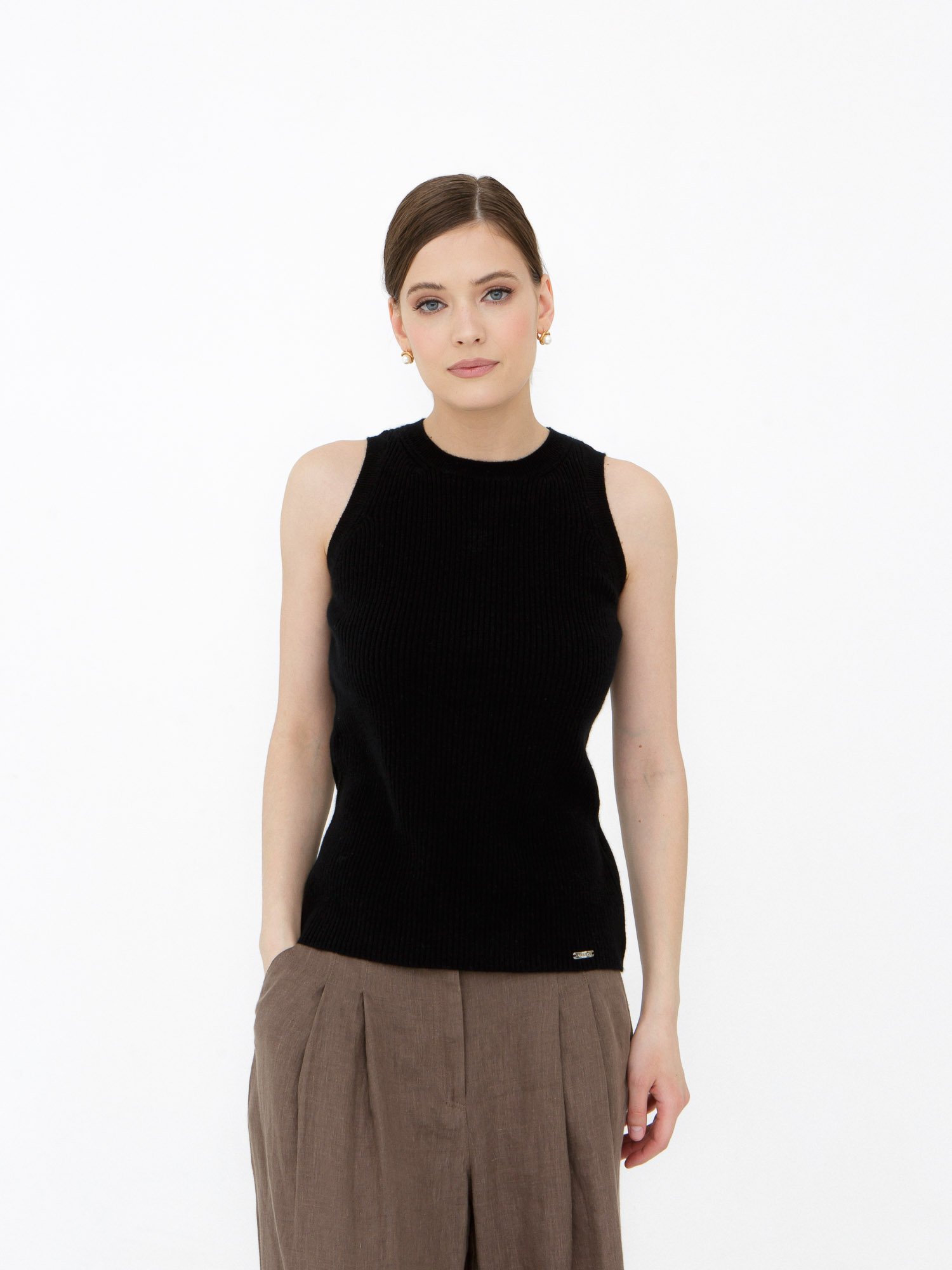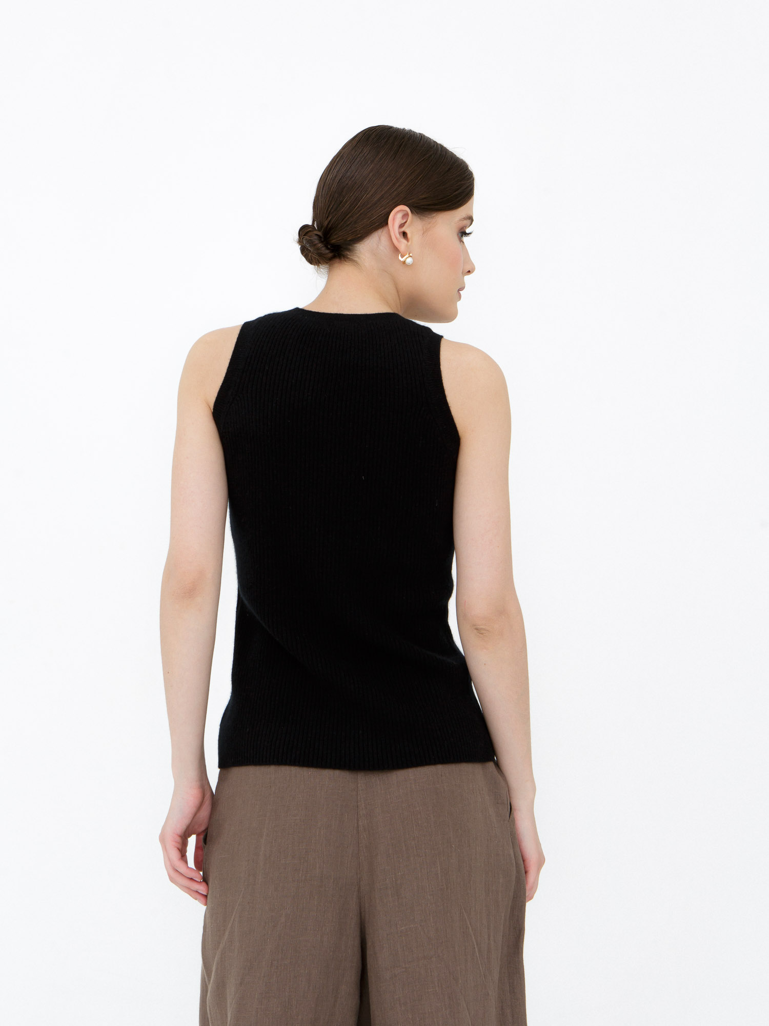Модель выполнена в лаконичном стиле без рукавов с аккуратной круглой горловиной. Чистые линии кроя подчёркивают современную эстетику изделия и делают его универсальным элементом гардероба. Низ и проймы аккуратно оформлены эластичной вязкой, которая помогает сохранять форму.