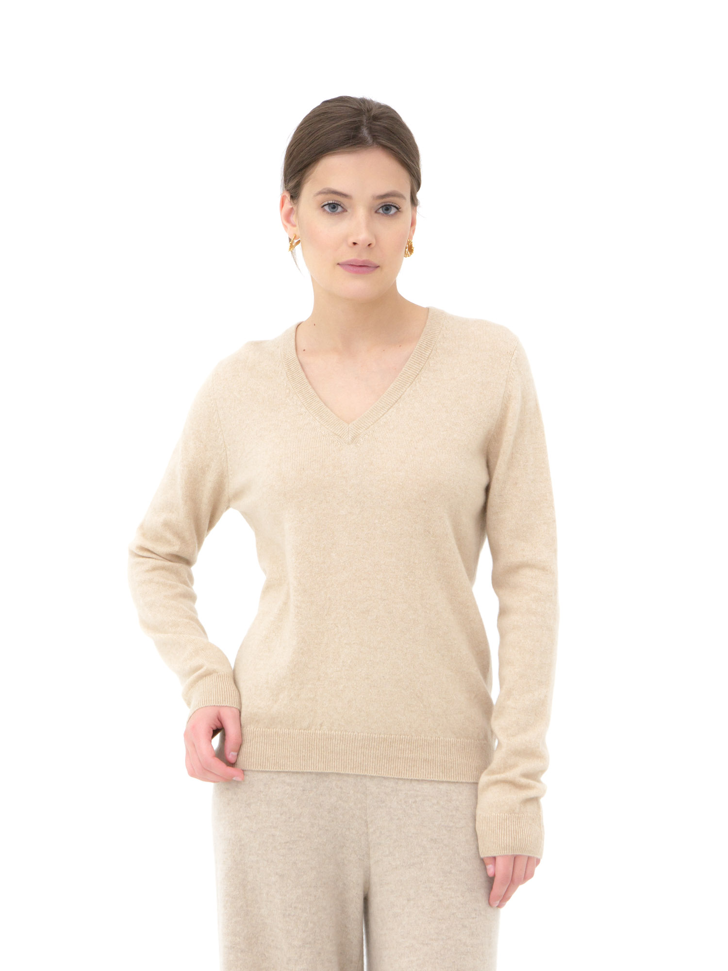 Модель выполнена в классическом прямом силуэте с аккуратным V-образным вырезом. Гладкая вязка подчёркивает благородную фактуру материала и делает изделие универсальным для разных стилей.