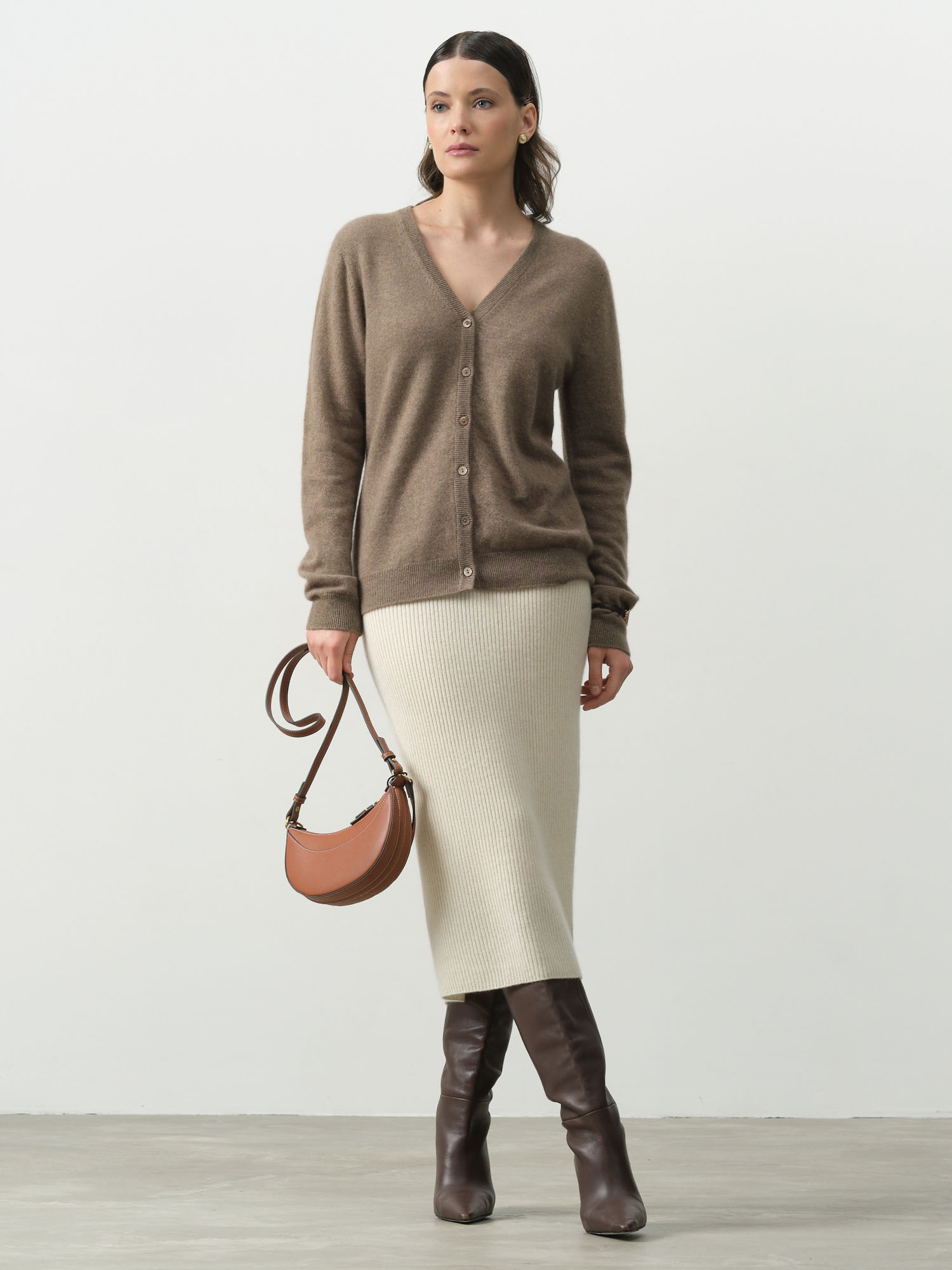 Юбка отлично сочетается с джемперами, водолазками и кардиганами. Подходит для создания элегантных и повседневных образов. Гармонично смотрится с сапогами, ботильонами или классической обувью.